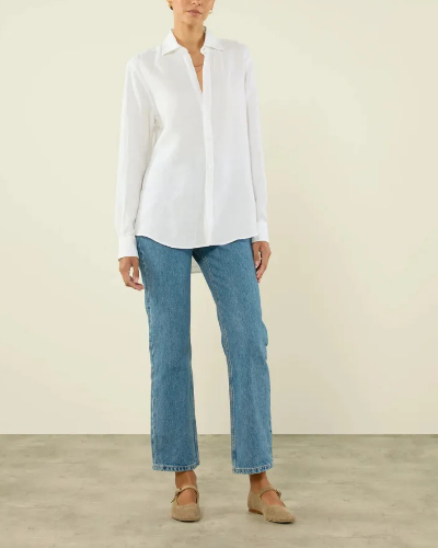 A fresh, airy look: a tucked-in shirt, slightly cuffed jeans, and classic ballet flats—the cornerstone of the Parisian wardrobe